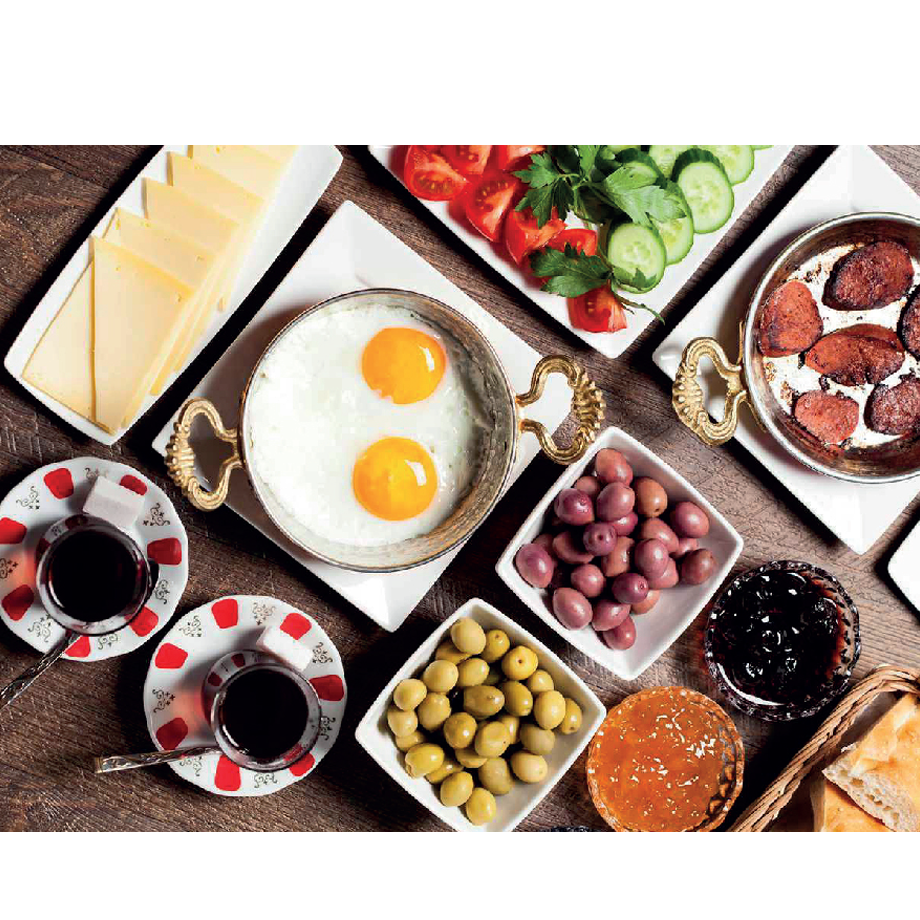 Sahanda Yumurta, Sigara Böreği, Sosis 2 adet, Paçanga Böreği 2 adet, Çecil Peyniri, Siyah Zeytin, Domates, Salatalık, Beyaz Peynir, Kaşar Peynir, Yeşil Zeytin, Havuç Tarator, Nutella, Bal, Kaymak, Dana Salam